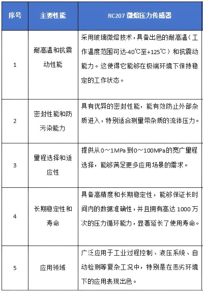 我公司自行研发生产的RC207系列压力传感器已经上市,该产品压力接口无焊缝、无硅油或其他有机物,密封性能好。传感器敏感器件采用玻璃微熔技术牢固烧结在压力座上,使传感器耐高温、抗震动等性能大幅度提升,保证了变送器在恶劣工业环境中使用的长期稳定性和可靠性,具有高寿命、压力循环次数可达1000万次以上等特点。