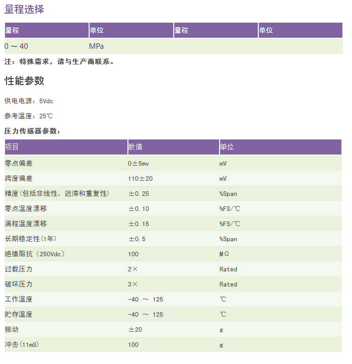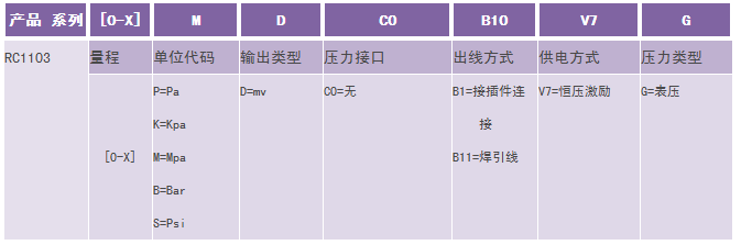 举例:RC1103-[0-40]MDC0B10V7G(RC1103系列微型微熔压力传感器,量程0-40MPa, mv输出,无压力接口,出线方式焊插针,恒压源供电,表压)