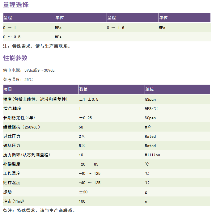 特点 1.全温区补偿 2.结构小巧、低成本、安装方便 3.宽介质适应范围 4.防雷击、抗干扰、抗振动、抗冲击 5.零下结冰不坏 6.无硅油、无密封圈、无污染 7.工作温度范围宽 8.设备配套适用 9.反极性保护 产品说明 RC6105恒压供水专用压力变送器是我公司推出的一款超小体积、高性能、低成本的工业用压力变送器。采用特殊结构设计和专门定制的放大电路,能有效抵制水锤效应,瞬间过压等问题。典型应用:净水机系统、 液压气压控制、楼宇自控,恒压供水、工业水泵和水处理系统 RC6105恒压供水专用压力变送器压力座采用17-4PH不锈钢单件一体式结构加工而成,一体化的不锈钢膜片使之过载性能远高于扩散硅、陶瓷等常用芯体,并且其压力接口无焊缝、无硅油或其他有机物,密封性能好。传感器敏感器件采用玻璃微熔技术牢固烧结在压力座上,使传感器耐高温、抗震动等性能大幅度提升,保证了变送器在工业恶劣环境中使用的长期稳定性、可靠性,经久耐用。在标准净化生产过程中,各项参数严格受控,整个产品经过了元器件、半成品及成品的严格测试及老化筛选,性能稳定可靠。