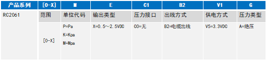 举例:RC2061-[0-1]M-X-C19-B2-V5-A (RC2061压力变送器,量程0-1MPa,0.5-2.5V输出,无螺纹压力接口,电缆出线,3.3V供电, 绝压) 注:特殊需求,请与生产商联系。 1、选型时请注意被测介质,产品与介质相接触的部分相兼容。 2、特殊要求,请与本公司商洽,并在订单中予以注明。