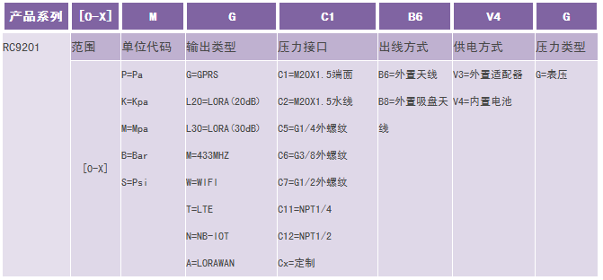 举例:RC9201-[0-1]M-G-C1-B6-V4-G (RC9201防爆型中高压无线压力变送器;压力范围0-1MPa;输出GPRS;螺纹接口M20*1.5;外置天线;内置电池供电;表压。) 注:特殊需求,请与生产商联系。 1、选型时请注意被测介质要与产品与介质相接触的部分相兼容。 2、需要零位压力为负压的变送器时,请在订货时注明量程范围。 3、特殊要求,请与本公司商洽,并在订单中予以注明。