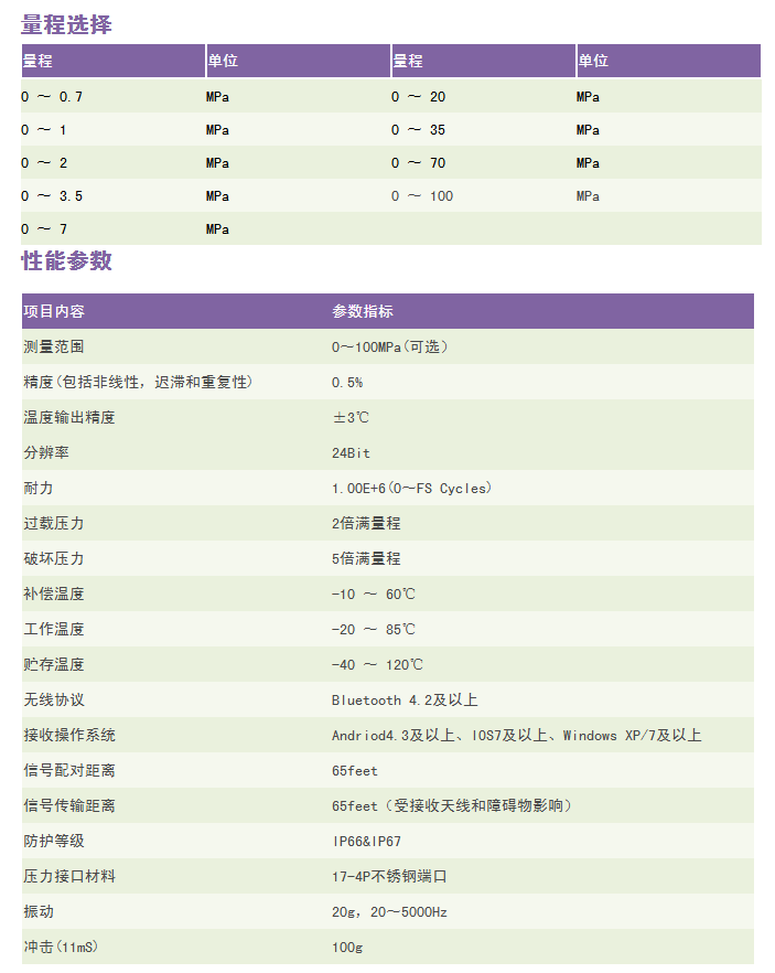 特点 1.支持蓝牙无线传输方式 2.低功耗 3.纽扣型电池供电,待机时间长 4.结构小巧,现场安装方便 产品说明 RC9401无线蓝牙型中高压压力变送器采用标准的2.4GHz无线通信协议,低功耗,电池使用寿命长。芯体采用硅微熔工艺,特点是不锈钢单件一体化结构;无O型圈、无焊缝、无硅油;压力范围广;量程覆盖范围宽;过载能力强。