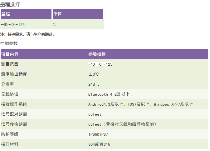 特点 1.支持多种无线传输方式 2.24位高精度ADC采集 3.电池供电 4.低功耗,静态电流*达15uA 5.结构小巧,现场安装方便 产品说明 RC9405蓝牙型无线温度变送器采用标准的2.4GHz无线通信协议,低功耗,电池使用寿命长。该变送器采用进口铂电阻温度传感器作为测量元件,采用24位高精度AD转换器采集温度信号。适应恶劣环境;量程覆盖范围宽;使用和携带方便;是您温度监控的好帮手。
