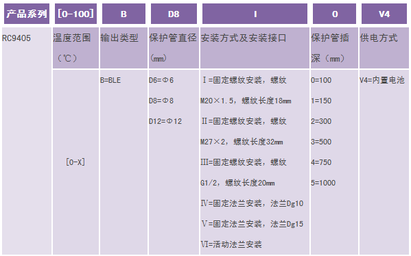 举例:RC9405-(0-100)BD8I0V4(RC9405蓝牙型无线温度变送器,温度范围0-100度,输出蓝牙,护管直径Φ8,安装方式固定螺纹M20*1.5,护管插深100mm,供电方式内置电池) 注:特殊需求,请与生产商联系。 1、选型时请注意被测介质要与产品与介质相接触的部分相兼容。 2、特殊要求,请与本公司商洽,并在订单中予以注明。