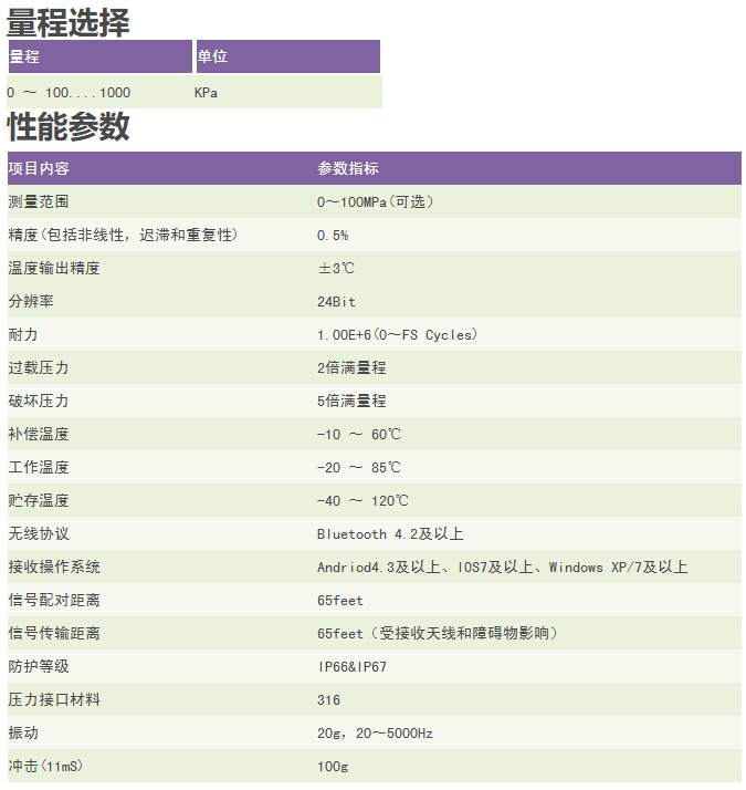特点 1.支持蓝牙无线传输方式 2.低功耗 3.纽扣型电池供电,待机时间长 4.结构小巧,现场安装方便 产品说明 RC9402蓝牙型低压无线压力变送器采用标准的2.4GHz无线通信协议,低功耗,电池使用寿命长。芯体采用采用扩散硅压力传感器作为压力信号测量元件。一体化的设计使蓝牙变送器适用于工业和商业领域,包括:海洋、住宅、露营,水利,灌溉,医疗和自动喷水灭火系统等,而且不要任何线缆,节约了客户的布线成本,真正达到节能环保的目的。