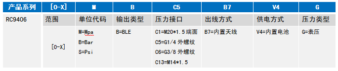 举例:RC9406-[0-1]M-B-C5-B7-V4-G(RC9406无线蓝牙型中高压无线压力变送器,量程1Mpa,输出蓝牙,压力接口G1/4外螺纹,内置天线,内置电池,表压) 注:1、选型时请注意被测介质,产品与介质相接触的部分相兼容。 2、特殊要求,请与本公司商洽,并在订单中予以注明。