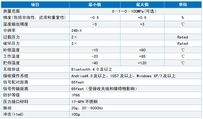 特点 支持蓝牙无线传输方式 低功耗 纽扣型电池供电,待机时间长 结构小巧,现场安装方便 产品说明 RC9401无线蓝牙型中高压压力变送器采用标准的2.4GHz无线通信协议,低功耗,电池使用寿命长。芯体采用硅微熔工艺,特点是不锈钢单件一体化结构;无O型圈、无焊缝、无硅油;压力范围广、量程覆盖范围宽;过载能力强。 量程选择