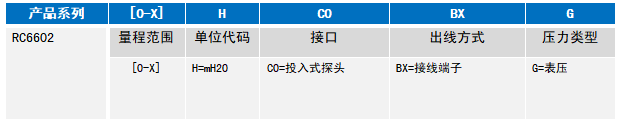 举例:RC6602-[0-3]H-C0-BX-G (RC6602液位变送器,量程0~3米水【标明线长】,二总线输出,投入式探头,接线端子【线缆自备】,表压) 注:1、选型时请注意被测介质,产品与介质相接触的部分相兼容。 2、特殊要求,请与本公司商洽,并在订单中予以注明。