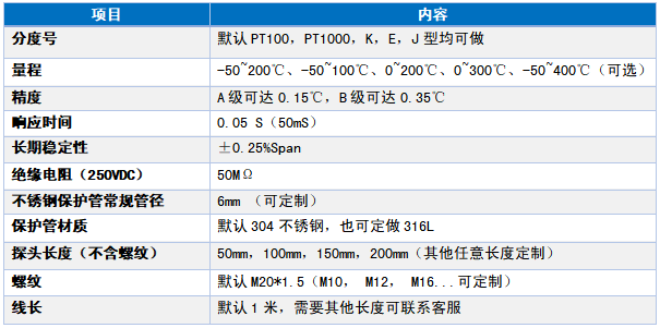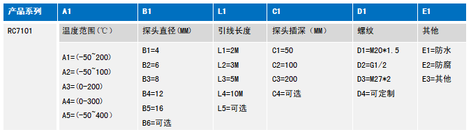 (步骤:用万用表量取电阻传感器三条引线接头之间的阻值。 其中两条之间的阻值应为0,另一条与其他之间的阻值约为100。将此根线标记为A.将标记为A的先接在A接线端上,其他的两根线分别接在其他两个接线端上,此两根线可以任意接。) 注:上面接线定义是部分示例,以实际出厂接线定义为准。 产品选型示例 示例的选型代码的含义如下: