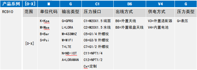 举例:RC910-[0-1]M-G-C1-B6-V4-G (RC910智能经济型无线压力变送器,压力范围0-1MPa,输出GPRS,螺纹接口M20*1.5,外置天线,内置电池供电,表压) 注:1、选型时请注意被测介质,产品与介质相接触的部分相兼容。 2、特殊要求,请与本公司商洽,并在订单中予以注明。